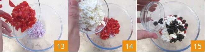 Em uma tigela grande, coloque a cebola, os tomatinhos 13, o feta 14, as azeitonas em rodelas 15