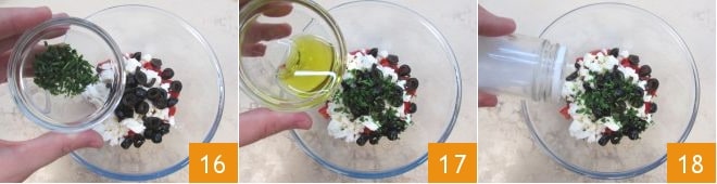 E a cebolinha 16. Tempere com o óleo 17 e uma pitada de sal 18: será suficiente pouco, porque o feta já é muito salgado.