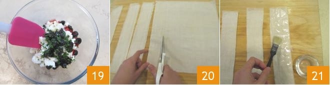 Misture bem para integrar os ingredientes 19 e reserve. Disponha então duas folhas de massa filo de 48x34 cm uma sobre a outra, e coloque-as sobre a superfície de trabalho, com o lado mais longo na base. Com a ajuda de uma tesoura, corte 8 tiras de 6 cm de largura 20. Pincele as tiras com um pouco de água para reidratá-las 21.