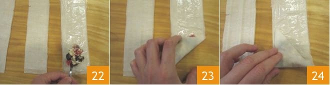 Coloque uma pequena colher de recheio na base da tira de massa filo 22, e dobre uma aba para criar um triângulo que envolva o recheio 23. Dobre da mesma forma o triângulo recém-formado sobre a tira 24