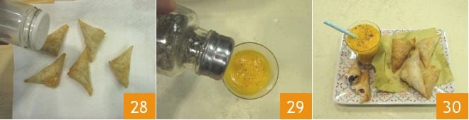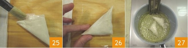 e continue dessa forma até terminar a tira de massa. Pincele a última aba com um pouco de água 25 antes de também fechá-la, para selar sua trouxinha 26. Faça as outras 7 trouxinhas dessa forma, depois repita com as outras 2 folhas de massa filo para fazer as últimas 8 trouxinhas. No total, você obterá 16. Aqueça o óleo de sementes em uma panela funda, e quando alcançar a temperatura de 170-180°, mergulhe alguns pacotinhos de cada vez e frite-os 27 cerca de meio minuto de cada lado até dourar.