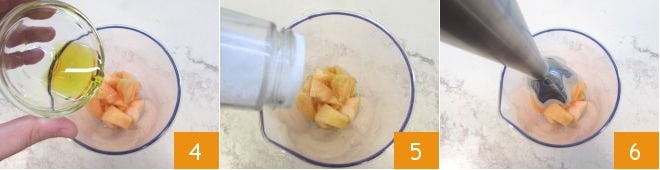 Coloque os pedaços de melão no copo do mixer e adicione o óleo 4 e uma pitada de sal 5. Com o mixer de imersão, bata cuidadosamente 6