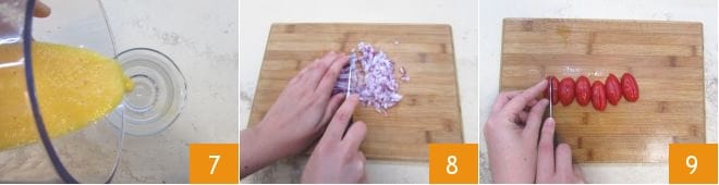 E depois transfira o purê obtido para uma jarra 7. Coloque a jarra na geladeira para manter seu suco de melão fresco. Enquanto isso, cuide das trouxinhas, começando pelos ingredientes do recheio. Pique finamente a cebola roxa 8 e reserve. Corte os tomatinhos ao meio no sentido do comprimento e, cortando-os no sentido do comprimento, obtenha tiras 9.