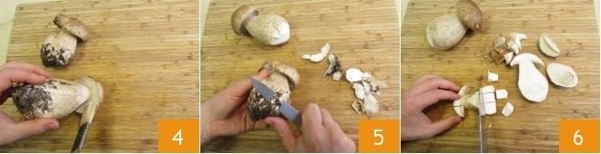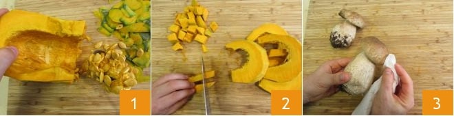 Para preparar o churrasco de abóbora e porcini, comece limpando a abóbora (você deve obter 400 g de polpa). Remova a casca, depois as sementes e os filamentos internos 1, em seguida, corte em fatias e depois em cubos de cerca de 2 cm 2. Passe para a limpeza dos porcini, primeiro com um pano umedecido 3