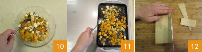 e depois com um pincel para raspar a terra 4. Descasque superficialmente a parte da raiz 5 e, por fim, corte em fatias e depois em cubos da mesma espessura da abóbora. À medida que você corta, coloque os cubos em uma tigela 6.