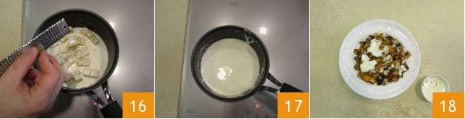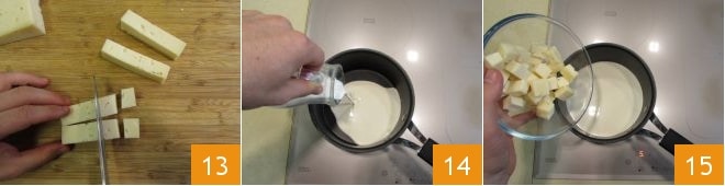 e cortando a fontina em cubos 13. Em uma panelinha, adicione o creme de leite 14 e a fontina 15,