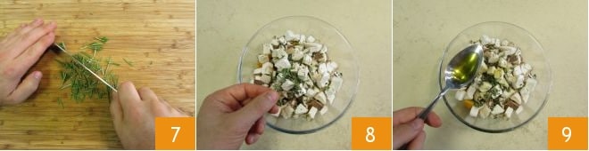 Depois, destaque as folhas de alecrim dos ramos e pique finamente 7, coloque na tigela junto com as folhas de tomilho separadas, também, dos raminhos 8. Tempere com sal e pimenta e depois adicione o óleo 9