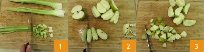 Para preparar o chutney de maçãs com açafrão, você deverá ter sanitizado potes e tampas conforme indicado na caixa no final da receita. Em seguida, proceda limpando o aipo: descasque e corte em pedaços grandes 1. Lave, seque e depois corte as maçãs ao meio, retire o miolo e, sem descascá-las, corte primeiro em fatias 2, depois em pedaços grandes 3.