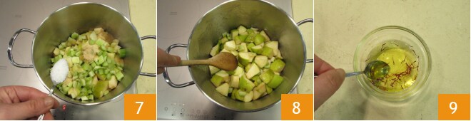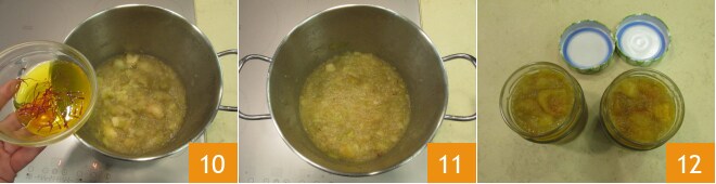 No final do cozimento, adicione os pistilos com a água deles 10, misture e deixe no fogo por mais 2-3 minutos 11. Desligue e, uma vez que esteja frio, seu chutney de maçãs com açafrão está pronto 12.
