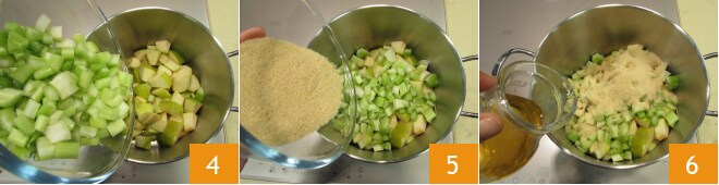 Em uma panela grande coloque as maçãs, o aipo 4, o açúcar mascavo 5 e o vinagre de maçã 6.