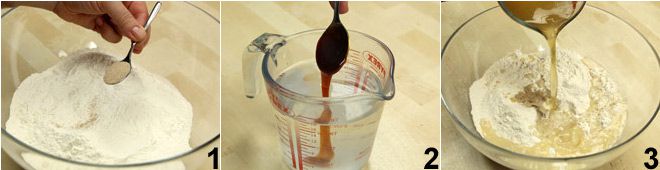 Veja como proceder para preparar a ciabatta não amassada. Despeje a farinha em uma tigela grande e, em seguida, adicione o fermento biológico seco 1. Dissolva o sal e o malte na água morna 2, misture bem e depois despeje a mistura na tigela 3 com farinha e fermento.
