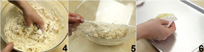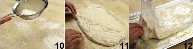 Misture apenas o necessário para incorporar os ingredientes 4, depois cubra a tigela com filme plástico 5 e deixe fermentar em temperatura ambiente (coloque a tigela dentro do forno desligado) por pelo menos 18 horas. Após o tempo indicado, a massa deve ter uma consistência cheia de bolhas e bastante pegajosa. Pegue uma assadeira, unte levemente 6 com azeite de oliva extravirgem.