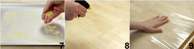 e polvilhe com farinha de milho 7. Em uma superfície de trabalho, borrife água 8 e coloque um pedaço de filme plástico por cima 9.