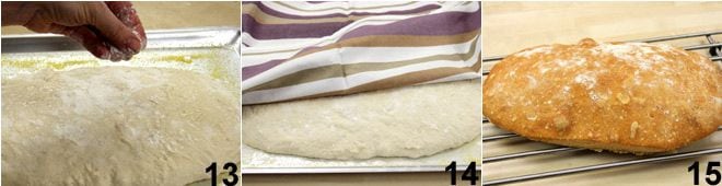 Devolva para ela uma forma plana e alongada, polvilhe a superfície com farinha 13 e depois cubra a ciabatta com um pano de prato limpo 14 e deixe fermentar por mais duas horas a 30°. Após as duas horas, asse em forno já quente por 40 minutos a 220°. Uma vez que a ciabatta não amassada tiver uma crosta dourada, retire-a do forno 15.