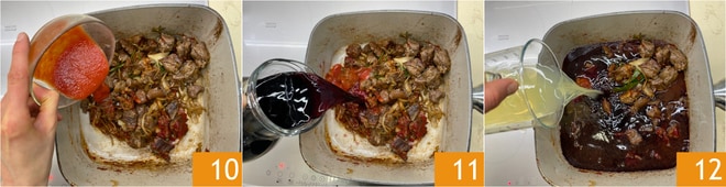 Adicione o molho de tomate 10, misture e cozinhe por 2 minutos. Adicione o vinho 11 e deixe evaporar todo o álcool. Finalmente, adicione o caldo de carne 12 e leve à ebulição.