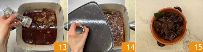 Tempere com sal e pimenta 13. Misture, cubra com uma tampa 14, abaixe o fogo ao mínimo e cozinhe por cerca de 3 horas, mexendo de vez em quando, até que a carne fique macia. Se necessário, para prolongar o cozimento, você pode adicionar água ou mais caldo. Sirva e decore com uma folha de louro. Seu javali ensopado está pronto para ser apreciado quente 15!