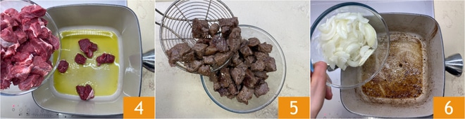 Em uma panela, coloque o óleo, adicione a carne 4 e doure em fogo médio-alto até dourar. Retire a carne 5 e reserve. Na mesma panela, coloque a cebola 6.