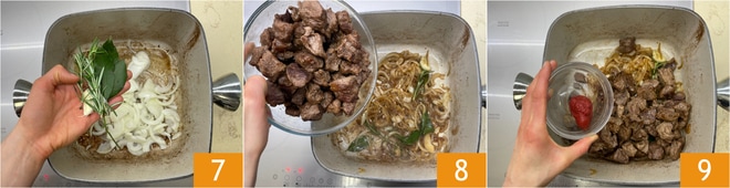 Adicione também os dentes de alho com casca esmagados, o louro e o alecrim 7. Refogue até que as cebolas fiquem transparentes, se necessário adicione um pouco mais de óleo. Adicione a carne 8, misture e cozinhe por alguns minutos. Adicione o extrato de tomate 9.