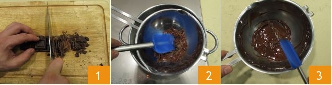 Para fazer os bombons de chocolate amargo com creme de mascarpone, comece picando o chocolate amargo com a faca 1, derreta o chocolate em banho-maria 2 até que esteja completamente derretido 3.
