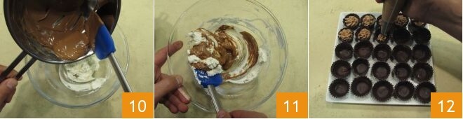 Despeje o chocolate ao leite derretido na tigela com o mascarpone 10, misture novamente até obter um creme homogêneo 11. Transfira o creme para um saco de confeitar com bico estrelado e coloque para firmar na geladeira por cerca de 1 hora. Após esse tempo, pegue tanto as cestinhas de chocolate quanto o creme, esprema uma porção de creme em cada bombom 12. Depois de rechear todos os bombons, decore metade com lascas de avelã e a outra metade com lascas de pistache.