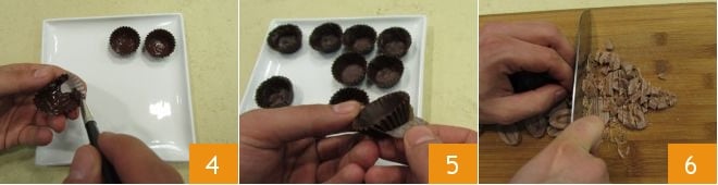Neste ponto, pincele o interior, incluindo as bordas, dos pequenos pirotines 4. Coloque-os em uma bandeja e deixe endurecer por 1 hora na geladeira. Após esse tempo, retire os pirotines, certifique-se de que o chocolate esteja bem firme e depois retire-os delicadamente 5. Enquanto isso, prepare o creme: pique também o chocolate ao leite 6,