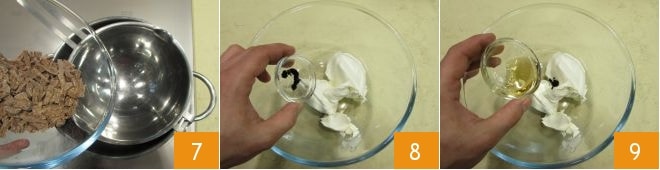 coloque-o em banho-maria 7 até que esteja completamente derretido. Em uma tigela separada, coloque o mascarpone, aromatize com as sementes extraídas da vagem de baunilha 8 e com o Rum 9 misture com uma espátula para incorporar.