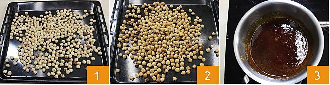 Para preparar os bombons, comece tostando as avelãs colocando-as em uma assadeira 1 em forno já aquecido a 150° por 35 minutos, até que fiquem bem douradas 2. Enquanto isso, prepare o caramelo (Caramelo mais indicações): em uma panela de aço com fundo duplo, adicione o açúcar refinado uma colher de cada vez na panela e derreta lentamente em fogo baixo, sem mexer, mas girando delicadamente a panela. Você deve obter um caramelo marrom 3, cuja temperatura deve oscilar entre 166°- 175° (ajude-se com um termômetro para alimentos).