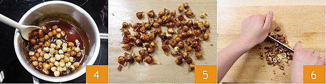 Adicione ao caramelo, metade das avelãs torradas e misture muito rapidamente 4. Coloque tudo em um tapete de silicone e separe as avelãs umas das outras 5. Ajude-se com um palito de madeira para não queimar as mãos. Deve ser uma operação muito rápida, caso contrário as avelãs não se separarão mais. Uma vez resfriadas, pique tanto as avelãs torradas quanto as caramelizadas com uma faca de cozinha 6 ou, se preferir, com um mixer (depende se prefere ter pedaços de avelã maiores ou menores).
