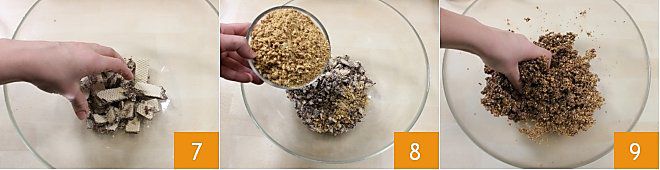 Agora complete o recheio que estará dentro dos bombons: em uma tigela, esfarele grosseiramente com as mãos os wafers 7 e adicione as avelãs picadas 8. Misture um pouco com as mãos, de modo que o creme dos wafers derreta um pouco e os ingredientes se misturem entre si 9.