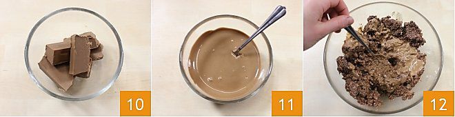 Derreta o chocolate gianduia no micro-ondas ou em banho-maria (10-11) e adicione-o à mistura de wafers e avelãs. Misture bem 12: o recheio dos bombons deve ser macio e compacto.