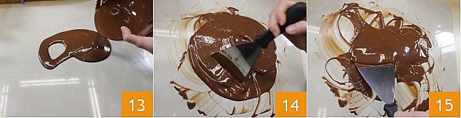 Neste ponto, derreta o chocolate amargo. Para que os bombons fiquem bem brilhantes e não opacos e esbranquiçados, o chocolate deve ser temperado, ou seja, nunca deve exceder 31°: assim você obterá bombons brilhantes que poderão ser conservados por mais tempo. Para realizar esta operação há duas possibilidades: ou derreta o chocolate em banho-maria e, munido de termômetro, continue mexendo até que esteja derretido mantendo a temperatura exigida. Se exceder 31° então, deve levar o chocolate a 45° no máximo 50° e, quando chegar à temperatura, despeje 2/3 em uma superfície de mármore (não é possível fazer isso em outras superfícies) 13 e, com uma espátula, mova rapidamente (14-15), mexendo continuamente, até que atinja a temperatura de 29°. Em seguida, despeje na tigela junto com o restante do chocolate e misture continuamente, até levá-lo a 31°.