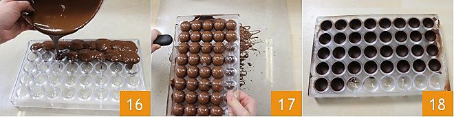 Agora pegue um molde de policarbonato para bombons e despeje dentro bastante chocolate derretido 16, vire o molde e bata no lado para que o excesso de chocolate escorra completamente 17. Remova ainda o excesso de chocolate ajudando-se com uma espátula; execute esta operação, que serve para criar a casca do bombom, ou seja, a estrutura externa, em uma bandeja para recuperar o chocolate derramado. Coloque para resfriar rapidamente por algumas horas, até que se formem pequenas bolhas brancas embaixo 18.