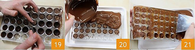 Preencha as cascas obtidas com uma colherzinha de recheio 19, tendo cuidado para não chegar até a borda, mas deixando 2-3 milímetros de espaço. Derreta novamente o chocolate, refazendo a temperagem, e, uma vez alcançados os 31°, despeje nos bombons 20, assim criando o fundo, e remova o excesso ajudando-se com uma espátula 21.