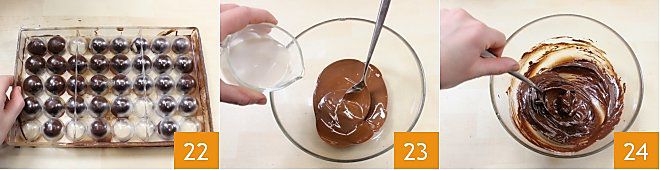 Coloque os bombons para resfriar por algumas horas. Quando estiverem bem firmes, desenforme: bata delicadamente o molde em uma superfície plana 22 e eles se soltarão. Coloque-os em uma bandeja ou prato de servir e prepare a ganache para a decoração: derreta o chocolate, adicione o creme de leite 23 e misture para incorporar 24. Transfira a ganache para um saco de confeitar com bico estrela estreito.