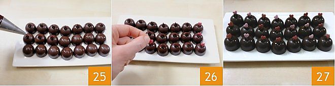 Decore cada bombom com um pequeno montinho de ganache na superfície 25 e um confeito em forma de coração no topo 26. Aqui está: os bombons estão prontos 27, vão desaparecer rapidamente!