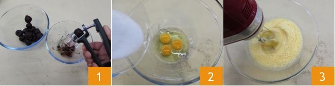 Para preparar o clafoutis de cerejas, lave as cerejas, seque, retire o pedúnculo e descaroce-as 1. Reserve e comece a preparar a massa: coloque em uma tigela os ovos, em temperatura ambiente, junto com o açúcar 2 e comece a batê-los com uma batedeira 3.