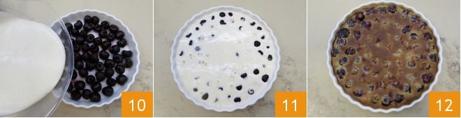 Distribua as cerejas sem caroço no fundo da assadeira, até cobrir toda a área 10 e despeje por cima a massa 11. Asse em forno estático pré-aquecido a 180° por 55 minutos, até que fique bem dourado na superfície 12 (se usar forno ventilado, asse a 160° por cerca de 45 minutos). Quando estiver assado, retire seu clafoutis de cerejas do forno, deixe amornar e sirva.
