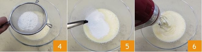 Assim que obter uma mistura clara e espumosa, que tenha dobrado de volume, adicione a farinha peneirada 4, o sal, as sementes da fava de baunilha 5 (para obtê-las, você deverá cortar a fava e raspá-la com uma faquinha). Continue a bater com a batedeira em velocidade baixa 6.