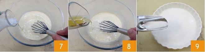 Mexendo com um batedor manual, adicione o leite, não muito frio, aos poucos 7 e o conhaque 8. Desta forma, você obterá uma massa não muito densa. Unte ligeiramente uma assadeira de bordas baixas com 28 cm de diâmetro e polvilhe-a com açúcar 9.