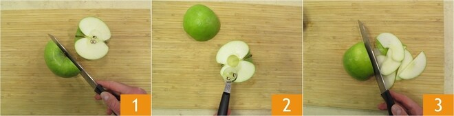 Para preparar o Club Sandwich do Tirol do Sul, primeiro corte a maçã ao meio 1, retire o miolo central com um cortador 2 e faça fatias finas 3.