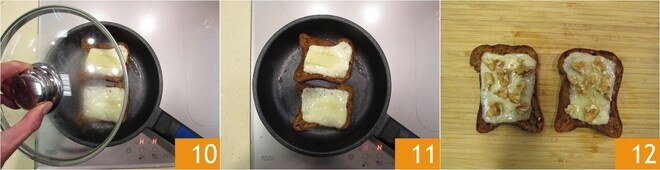 Cubra com uma tampa 10, abaixe o fogo e deixe o queijo derreter 11. Coloque as nozes sobre o queijo derretido 12.
