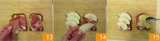 Adicione por cima as fatias de speck 13 e as fatias de maçã 14. Adicione uma camada fina de mel sobre as maçãs 13.