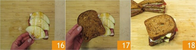 Agora coloque uma fatia de pão recheada sobre a outra 16 e cubra com uma das duas fatias de pão que você reservou 17. Faça o mesmo para o segundo sanduíche 18 e sirva seu Club Sandwich do Tirol do Sul!