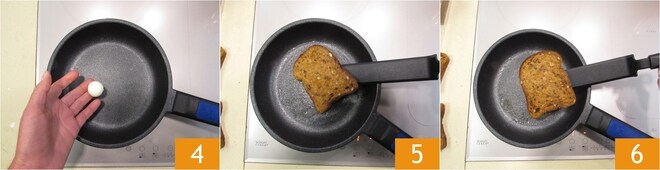 Agora, em uma frigideira, coloque uma colher de manteiga 4 e, assim que derreter, coloque as fatias de pão dentro 5. Torre em fogo alto de ambos os lados 6, deve ficar bem dourado.