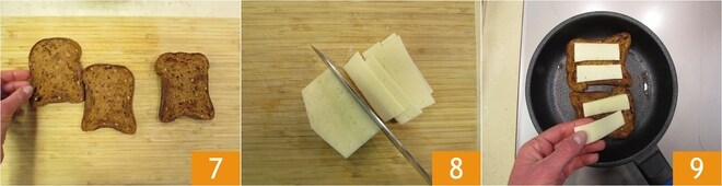 Transfira as fatias de pão para uma tábua 7. Corte o queijo em fatias 8 e coloque sobre 4 das 6 fatias de pão. Coloque novamente na frigideira 9.