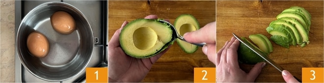 Para preparar o club sandwich de salmão, comece cozinhando os ovos: coloque os ovos inteiros em uma panela, cubra com água e cozinhe por 8 minutos a partir do momento em que começar a ferver 1. Enquanto isso, prepare os outros ingredientes: divida o abacate ao meio, retire o caroço e separe a polpa da casca com a ajuda de uma colher 2, depois corte-a em fatias não muito finas 3.