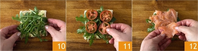 Adicione algumas folhas de rúcula 10, coloque as fatias de tomatinhos 11 e tempere com uma pitada de sal. Continue com o salmão defumado 12.