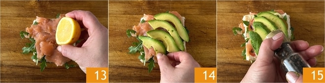 Despeje algumas gotas de suco de limão 13, depois coloque as fatias de abacate 14 e tempere com uma pitada de pimenta 15.