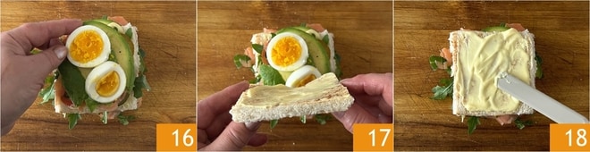 Por último, adicione os ovos cozidos em fatias 16. Espalhe maionese em outra fatia de pão e coloque-a com o lado da maionese voltado para os ovos 17. Espalhe maionese também no lado voltado para cima 18 e continue repetindo a mesma sequência de ingredientes.