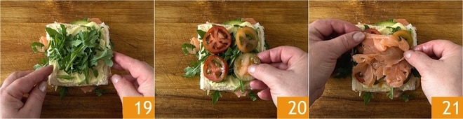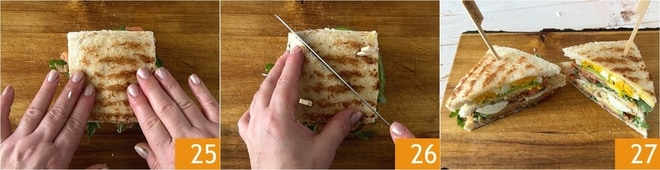 Cubra o sanduíche sempre colocando o lado do pão com a maionese voltado para baixo 25. Espete dois cantos opostos com dois palitos para estabilizar as camadas e divida o club sandwich ao meio 26. Proceda da mesma forma para fazer o segundo. O seu club sandwich de salmão está pronto para ser saboreado 27!